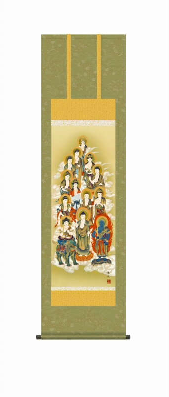 掛け軸 十三佛 解説 御先祖様の初七日から三十三回忌まで、十三回の追善供養をつかさどる十三佛を一幅におさめた仏画掛け軸です。 あらゆる仏事にお飾りいただけるのはもちろん、ご家族の安全や家運隆盛を願って日常掛けとしてもお掛け下さい。 作者 中山雪邨(三美会) 軸寸法 幅44.5×164cm(尺三) 本紙 新絹本 表装 洛彩緞子佛表装 軸先 陶器 種類 高精細巧芸画(手彩入り)・・・世界の有名美術館が...