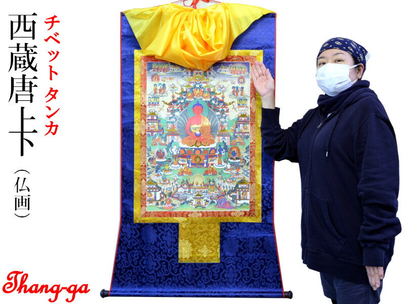 タンカ(仏画)はチベット佛教の仏画の掛け軸のことで、元々は佛僧が説法を行う際に持ち運びが便利なように掛け軸の形にしたものと言われています。描かれた絵には宗教世界が反映されたものやチベットの伝説、民間故事などが題材として好まれます。末広がりで下辺が長く、包布と呼ばれる絵を保護する薄布が付けられます。本商品は仏を中心とした、世界人民が平等で苦痛が全て取り除かれた「極東世界」が描かれたタンカになります。...