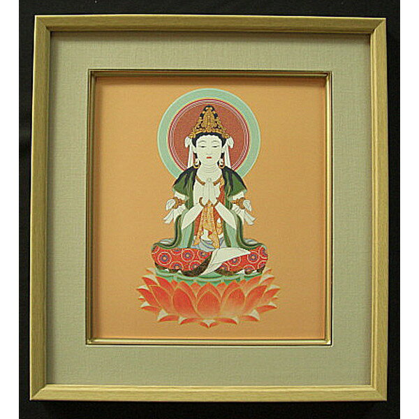 あらゆる厄難を祓いのける慈悲深い観音様 同梱購入される方だけの特典-特製オニックス製風鎮(ふうちん-掛け軸の装飾品)を 特別価格にてご提供しております♪ 仏画掛け軸で厳かな空間を創造する!一幅の掛軸が床の間を演出いたします! 金色の光彩を放ち、西方浄土の極楽の地より現れになった観音様。慈悲に満ちあふれる優しいご尊顔に深い安らぎと浄福を感じる逸品です。 ●幅54.5×高さ190cm ●本紙・・・新絹...