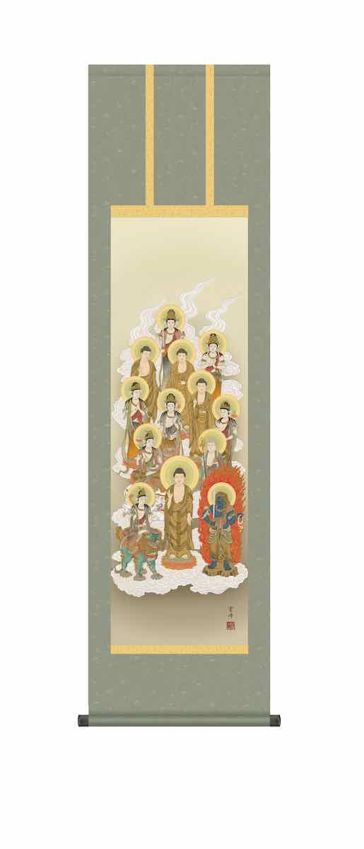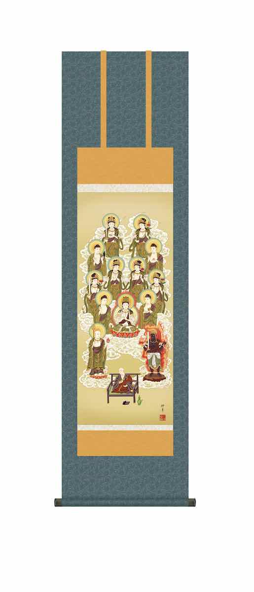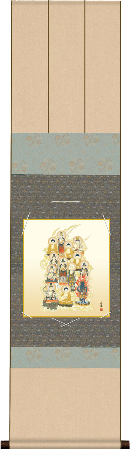 ■【スーパーSALE10%OFF】10年保証 掛け軸 仏画 行事飾り 仏事画 十三佛(じゅうさんぶつ)清水 雲峰 尺三 化粧箱付き 洛彩緞子佛表装(らくさいどんすぶつびょうそう) モダン 掛軸 床の間 和室 おしゃれ 壁掛け 絵