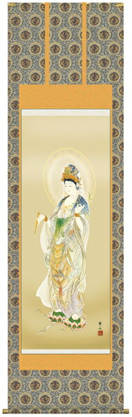 本紙 :新絹本(特殊印刷 + 手彩色) サイズ:幅54.5 x 高さ190cm(尺五) 表装 :金襴佛表装 軸先 :金メッキ金軸 収納 :桐箱畳紙収納 表装品質10年間保証付き (作品構図 国内生産にこだわった商品です)詳細画像 柳の葉の一振りで病難を祓う観音様柳の葉の一振りすればたちまちに病難を祓いのけるという有難い観音様を、精緻な線描と荘厳な色ずかいで丹念に描き上げた仏画の名品です。作家略歴金...