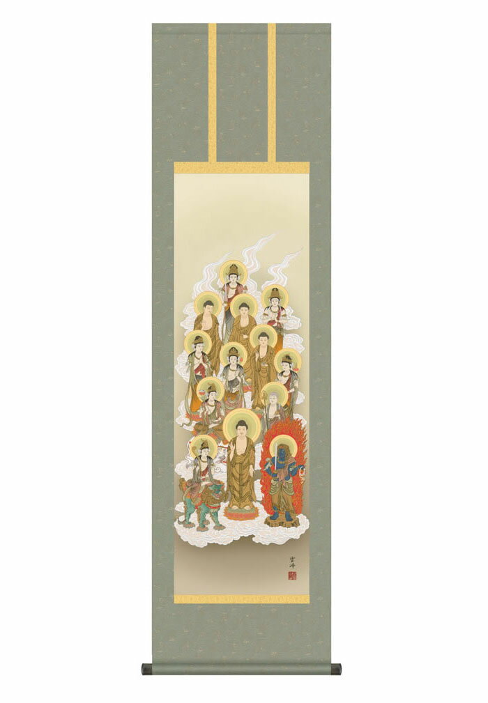 ■掛け軸 掛軸 仏書画 十三佛 じゅうさんぶつ 幅44.5×高さ約164cm 清水雲峰 尺三 仏具 仏事 命日 お彼岸 お盆 おぼん かけじく 法要 初七 三十三回忌 月命日 仏事掛軸 洛彩緞子丸表装 化粧箱収納 絵 モダン おしゃれ 床の間 和室 日本画 収納箱 壁掛け 壁 飾る