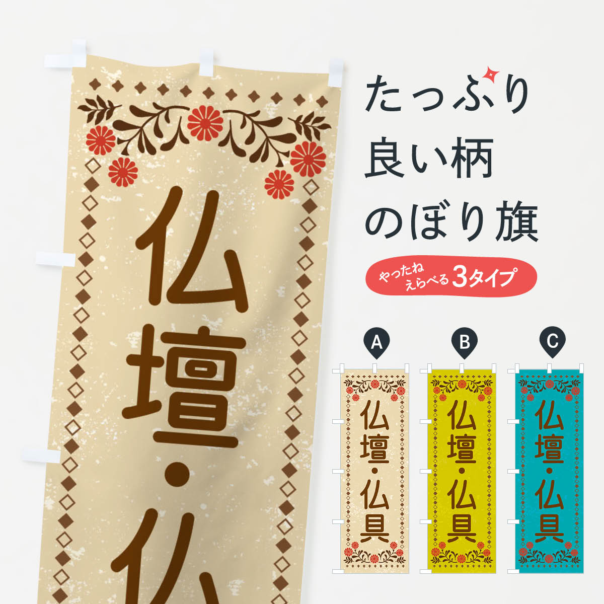 グッズプロののぼり旗は「節約じょうずのぼり」から「セレブのぼり」まで細かく調整できちゃいます。のぼり旗にひと味加えて特別仕様に一部を変えたい店名、社名を入れたいもっと大きくしたい丈夫にしたい長持ちさせたい防炎加工両面別柄にしたい飾り方も選べます壁に吊るしたい全面柄で目立ちたい紐で吊りたいピンと張りたいチチ色を変えたいちょっとおしゃれに看板のようにしたい仏具のぼり旗、他にもあります。【ネコポス送料3...
