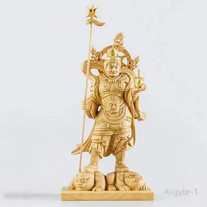 ■置物(びしゃもんてん 木彫り 七福神 フィギュア 仏像 多聞天 柘植(ツゲ)木製彫刻 毘沙門天−高さ11.5cm 極小仏像