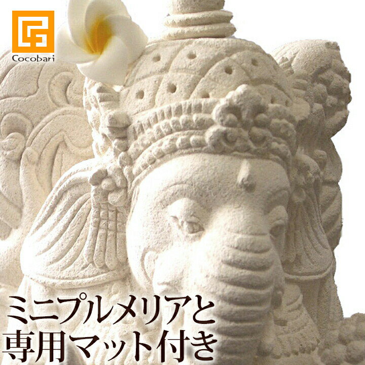 ■ガネーシャ ※プルメリア(頭飾り用ミニ1個、3.5cm 10個)と専用マット付き 【 置物 石像 白 ストーン インド 神様 バリ 石彫り バリ島 パラスストーン エスニック雑貨 アジア雑貨 】
