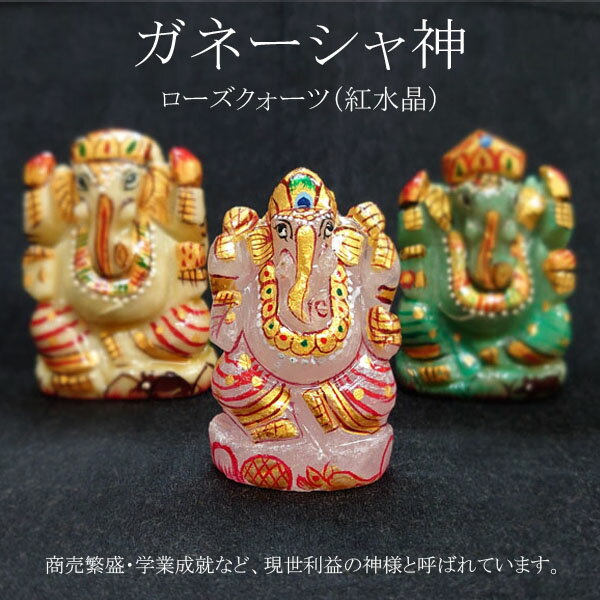 ▼ガネーシャ神 「夢をかなえる象」「商売の神様」「学問の神様」「除災厄除」「財運向上」など、すべての開運の神様として、世界的に人気と信仰を集めています。新しいことをはじめる時に、資格試験に向けて、健康を祈願など、どなたでもおすすめです。 ▼ローズクォーツ(紅水晶) 優しいピンク色をした水晶です。その色からも連想できるように、女性としての魅力をアップさせたり、愛情をはぐくむ力を持っているとされていま...