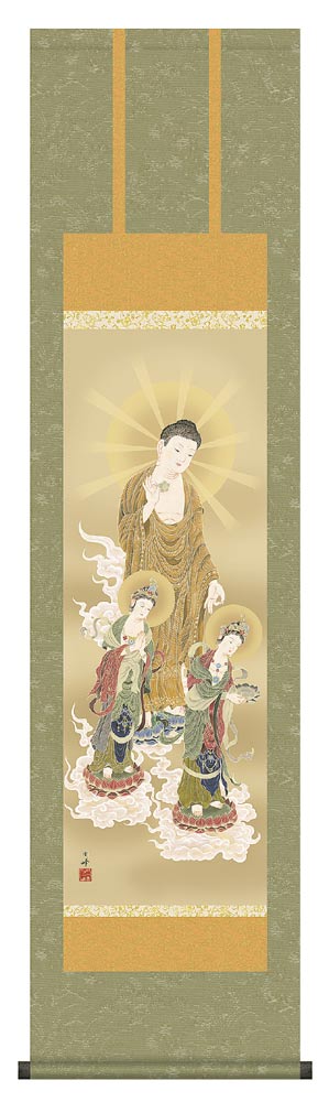 ■掛け軸 高精細巧芸画 純国産掛け軸 仏事画 高畠 周峰 「阿弥陀三尊佛」 尺三 オニックス風鎮 防虫香サービス