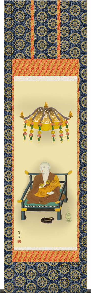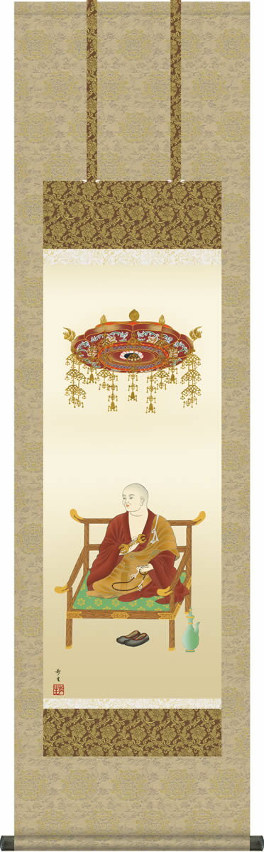 真言宗の開祖、弘法大師様の徳高いご尊像宗派を超えて今も尚慕われる、真言宗の開祖・弘法大師空海。その慈愛に満ちあふれたお姿を日々お飾りになり御遺徳を偲んでいただきたい逸品です。 ●幅54.5×高さ190cm ●本紙・・・新絹本 ●軸先・・・陶器 ●桐箱畳紙収納 ●表装品質十年間保証付き 日本画構図の開発と国内生産品にこだわった製品です! 作品は特殊印刷に手彩色仕上げとなっています。 ※受注制作・取寄...