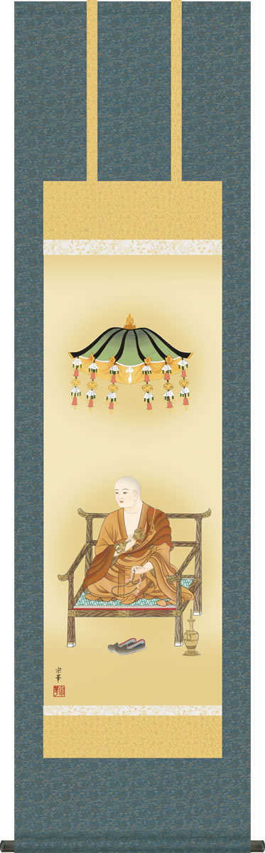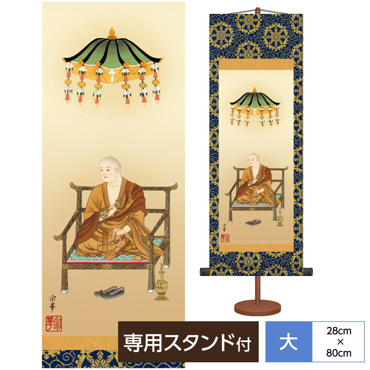 ■掛け軸 掛軸 床の間 モダン 和風 法要短尺 弘法大師 真言宗の開祖 弘法大師空海が優しく微笑む 大森宗華 弥栄会 サイズ幅28cm 高さ80cm 化粧箱収納 専用スタンド付き巨匠 複製画 タペストリー かわいい おしゃれ