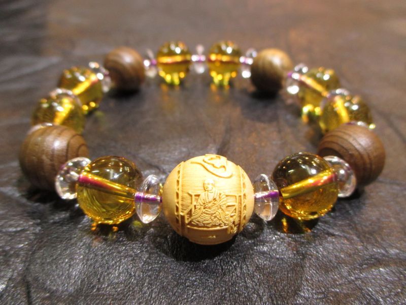 ■パワーストーン・京都/【南無大師遍照金剛(弘法大師・空海)】両面彫刻【柘植】15mm【黄水晶】【そろばん珠水晶】【神代杉】ブレスレット、桐箱付き【天然石の京屋】